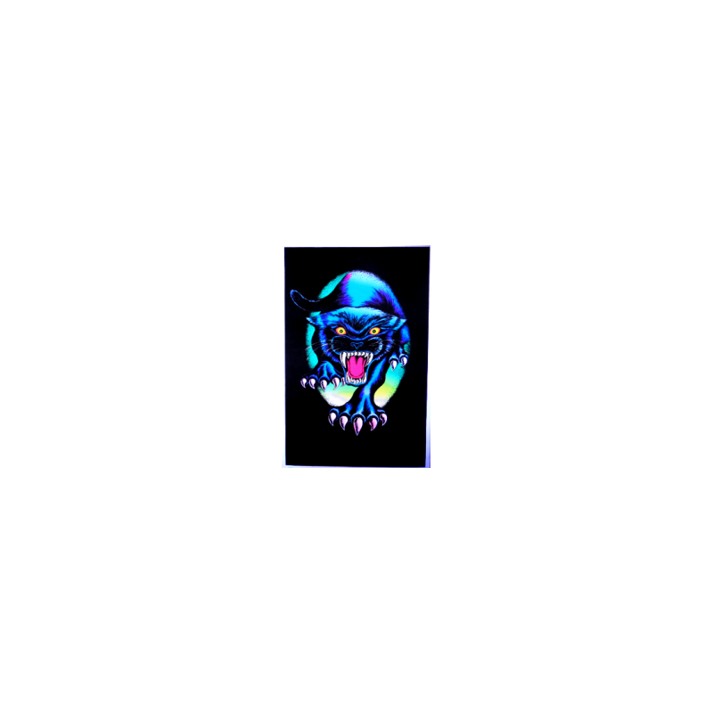 Poster en relief, texture velours, couleur fluorescent. Le poster réagit à la lumière noire, bleue ou violette, et crée une image en relief 3D. Le motif et/ou le personnage semble sortir du décor. Dimansions 90 x 60cm