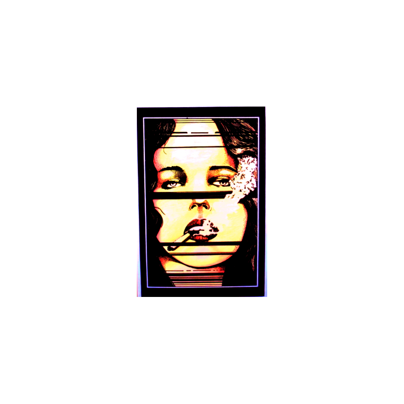 Poster en relief, texture velours, couleur fluorescent. Le poster réagit à la lumière noire, bleue ou violette, et crée une image en relief 3D. Le motif et/ou le personnage semble sortir du décor. Dimansions 90 x 60cm