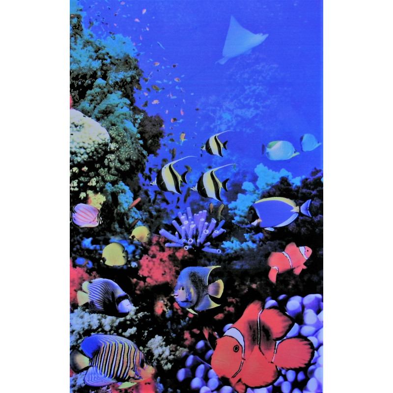 Poster en relief, texture velours, couleur fluorescent. Le poster réagit à la lumière noire, bleue ou violette, et crée une image en relief 3D. Le motif et/ou le personnage semble sortir du décor. Dimansions 90 x 60cm