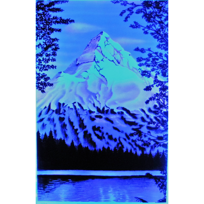 Poster en relief, texture velours, couleur fluorescent. Le poster réagit à la lumière noire, bleue ou violette, et crée une image en relief 3D. Le motif et/ou le personnage semble sortir du décor. Dimansions 90 x 60cm