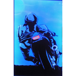 Poster en relief, texture velours, couleur fluorescent. Le poster réagit à la lumière noire, bleue ou violette, et crée une image en relief 3D. Le motif et/ou le personnage semble sortir du décor. Dimansions 90 x 60cm
