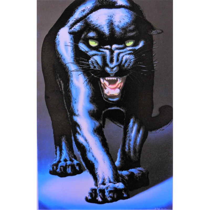 Poster en relief, texture velours, couleur fluorescent. Le poster réagit à la lumière noire, bleue ou violette, et crée une image en relief 3D. Le motif et/ou le personnage semble sortir du décor. Dimansions 90 x 60cm
