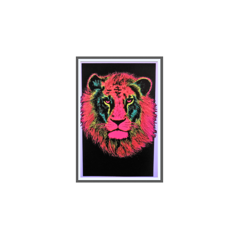 Poster en relief, texture velours, couleur fluorescent. Le poster réagit à la lumière noire, bleue ou violette, et crée une image en relief 3D. Le motif et/ou le personnage semble sortir du décor. Dimansions 90 x 60cm