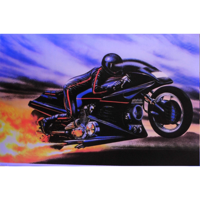 Poster en relief, texture velours, couleur fluorescent. Le poster réagit à la lumière noire, bleue ou violette, et crée une image en relief 3D. Le motif et/ou le personnage semble sortir du décor. Dimansions 90 x 60cm