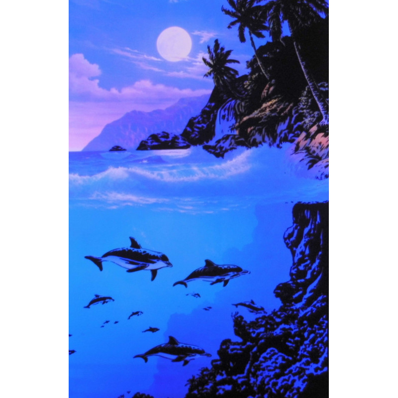 Poster en relief, texture velours, couleur fluorescent. Le poster réagit à la lumière noire, bleue ou violette, et crée une image en relief 3D. Le motif et/ou le personnage semble sortir du décor. Dimansions 90 x 60cm
