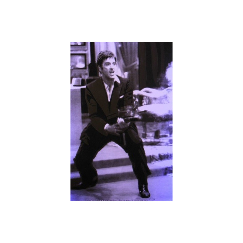 Poster en relief, texture velours, couleur fluorescent. Le poster réagit à la lumière noire, bleue ou violette, et crée une image en relief 3D. Le motif et/ou le personnage semble sortir du décor. Dimensions 90 x 60cm