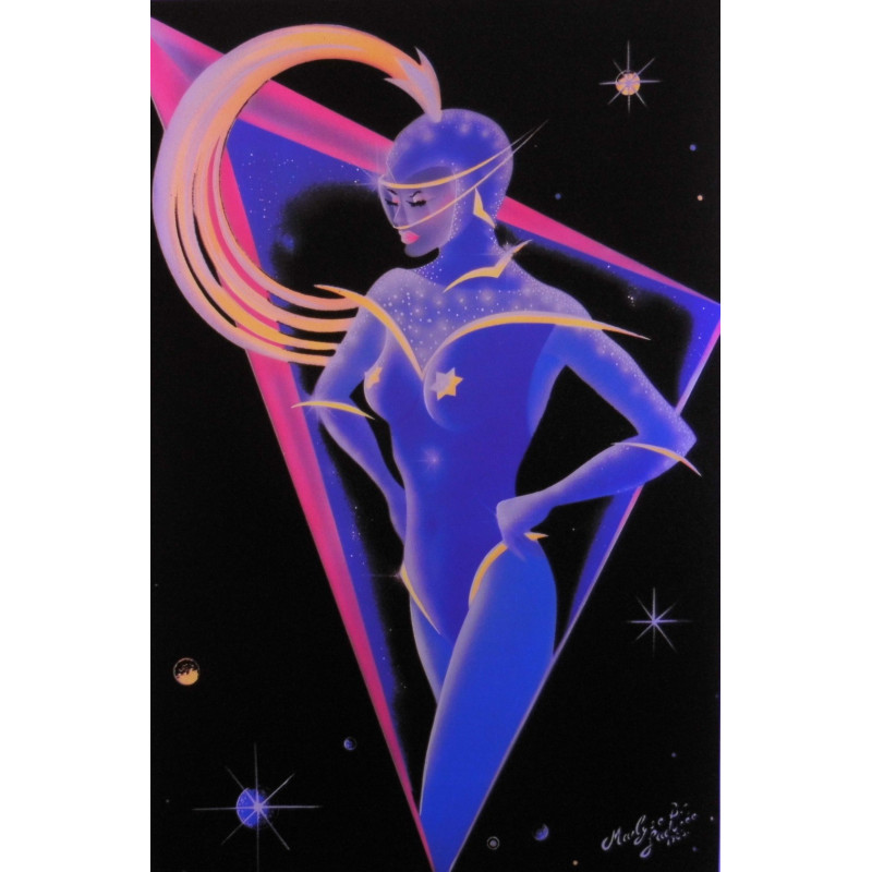 Poster en relief, texture velours, couleur fluorescent. Le poster réagit à la lumière noire, bleue ou violette, et crée une image en relief 3D. Le motif et/ou le personnage semble sortir du décor. Dimansions 90 x 60cm